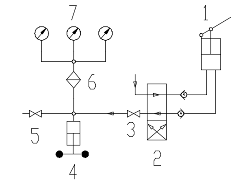 1、預(yù)壓泵 2、換向閥3、截止閥4、調(diào)壓器5、泄壓閥6、排污口7、接表座