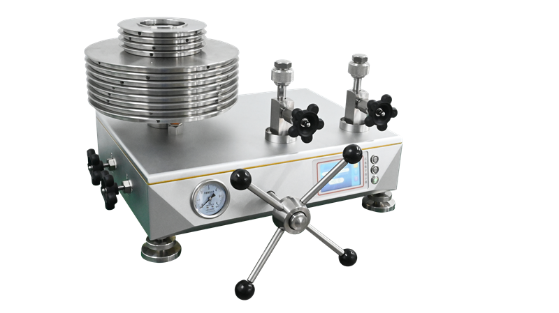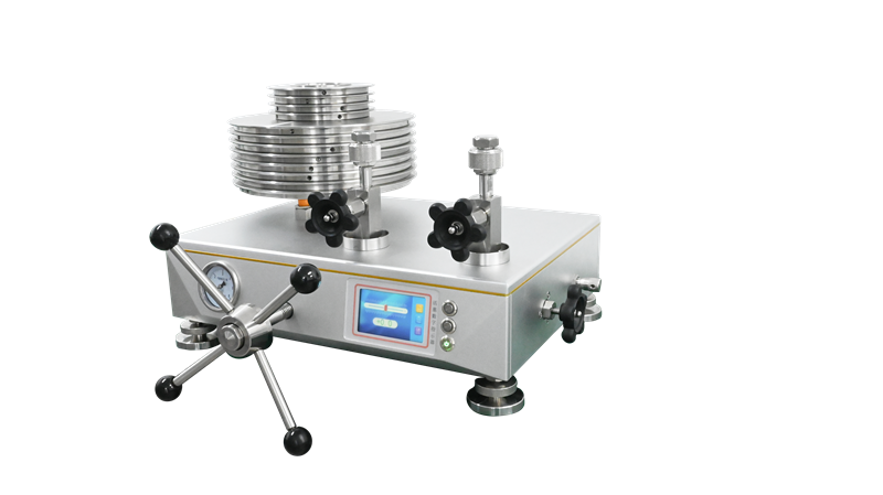 氣體活塞式壓力計,是利用流體靜力平衡(即作用在活塞有效面積上的流體壓力與其所負荷的重力相平衡)原理進行壓力測量的計量器具,一般由活塞系統(tǒng)、專用砝碼、壓力校驗器組成,另外還需配備相應(yīng)的氣源或自帶壓力泵。其量程為:-100kPa~0kPa~600kPa