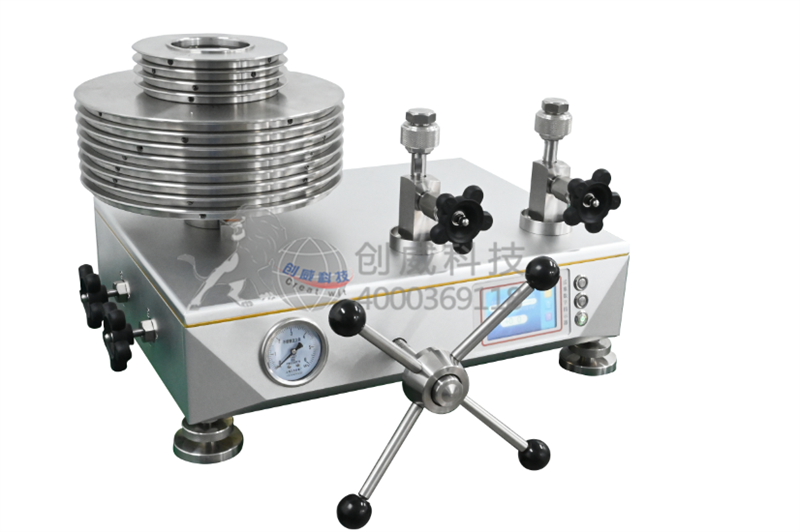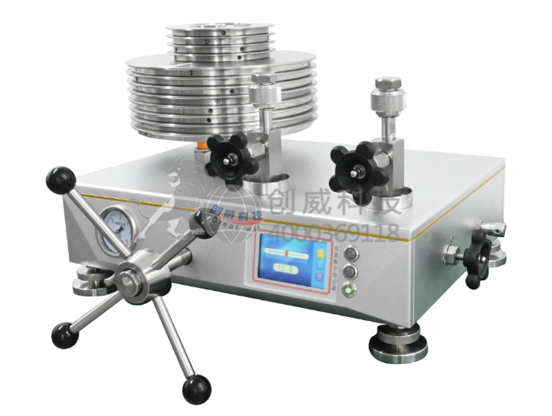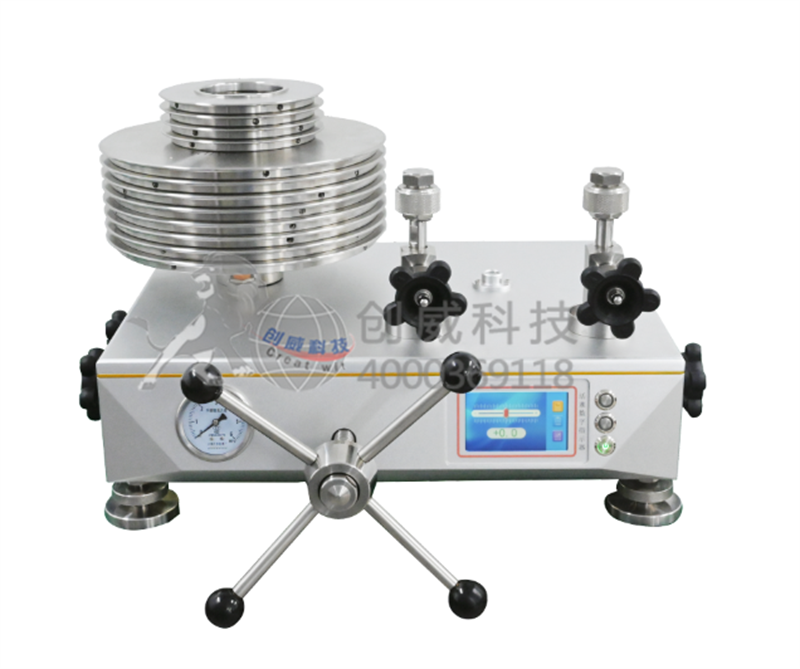 ●兩個被檢表接頭處設(shè)計有兩個截止閥,截止閥能及時關(guān)閉被檢系統(tǒng)之間的壓力。由于活塞式壓力計在加減砝碼時,需要減壓將活塞降下來,而被檢精密壓力表、壓力變送器、傳感器等和系統(tǒng)之間若不能被截止,表中的壓力會隨著活塞升降而升降,則考核不出被檢表的回程誤差,特意設(shè)計的壓力轉(zhuǎn)換閥,在關(guān)閉時,可不用砝碼單獨工作,即活塞壓力計臺子可作為壓力泵或壓力源獨立使用。