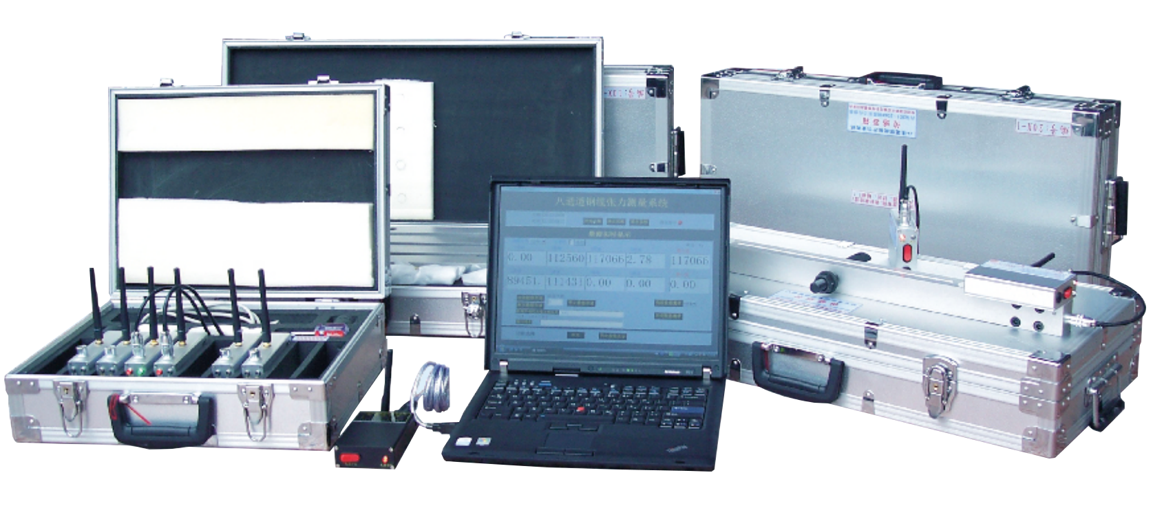 八通道鋼纜張力系統(tǒng)由8套內(nèi)置無線數(shù)據(jù)通訊系統(tǒng)的張力傳感器、數(shù)據(jù)接收器、計(jì)算機(jī)和專用測量軟件等相關(guān)附件組成。